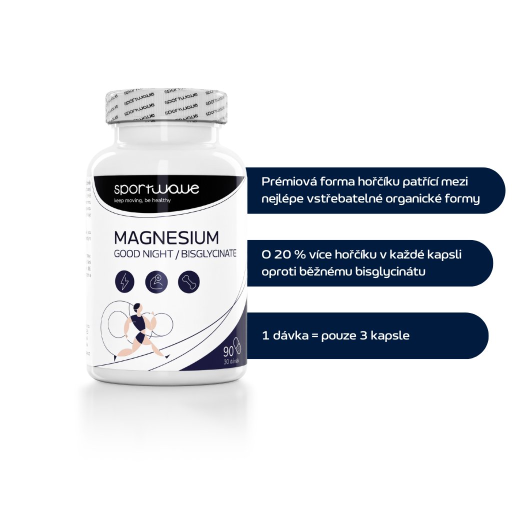 Aktivní životní styl, sport, stres, nepravidelný režim, vyšší příjem cukru nebo alkoholu – to všechno může zvyšovat nároky na hořčík. MAGNESIUM GOOD NIGHT – BISGLYCINATE staví na organické formě hořčíku s vysokou využitelností a nabízí 450 mg hořčíku (120 % RHP) v denní dávce. Praktické kapsle jsou ideální pro dlouhodobé užívání, zejména večer před spaním, kdy chcete podpořit nervovou soustavu, svaly a kvalitní regeneraci.
